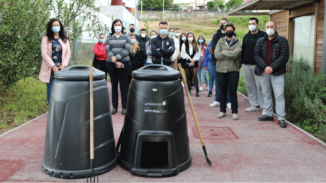 A entrega dos compostores e a formação necessária para a sua utilização foi feita pela Ambisousa na sexta-feira passada, dia 23 de abril, onde estiveram presentes os estudantes do 2º ano da Licenciatura em Segurança do Trabalho e Ambiente, o coordenador do projeto, Prof. Miguel Lopes e a Presidente da ESTG, Dorabela Gamboa. Estes recipientes compostores permitirão que todos contribuam para a produção de adubo/fertilizante natural a partir de algum do lixo orgânico que produzimos.