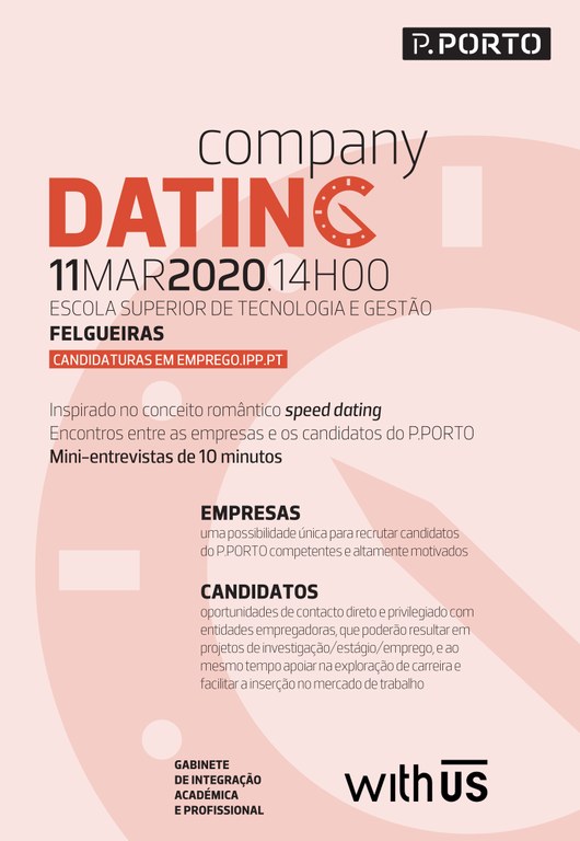 A iniciativa Company Dating é inspirada no conceito romântico de speeddating que promove encontros entre empresas/organizações e os estudantes/diplomados do P. PORTO. Num ambiente informal, com música ambiente e serviço de café, os candidatos têm a oportunidade de se apresentar numa minientrevista de 10 minutos para descobrirem a viabilidade de uma futura colaboração.