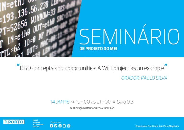 A aula que decorre, dia 14 de janeiro tem como convidado Paulo Silva que fará a apresentação: “R&D concepts and opportunities: A WiFi project as an example”.